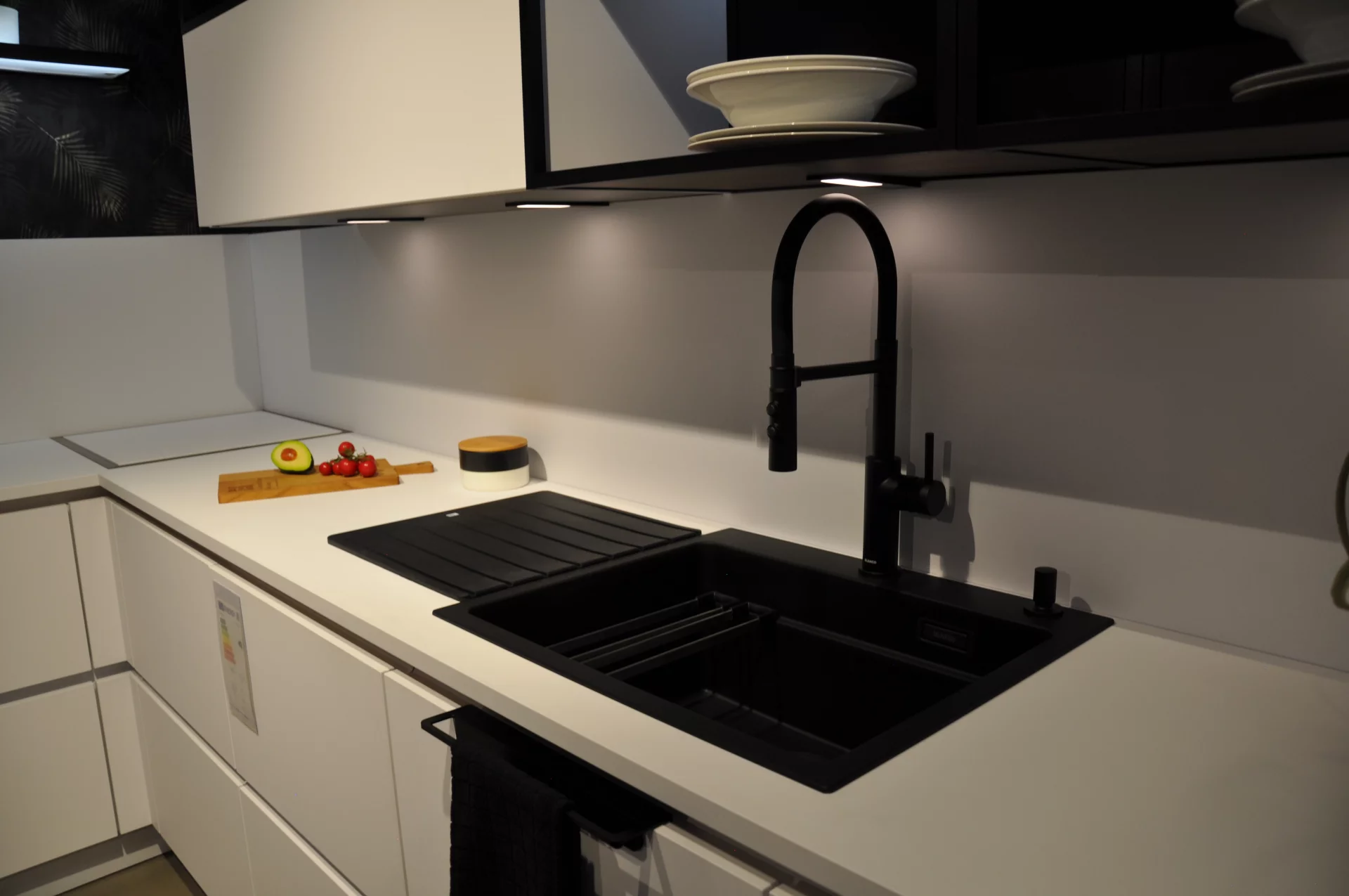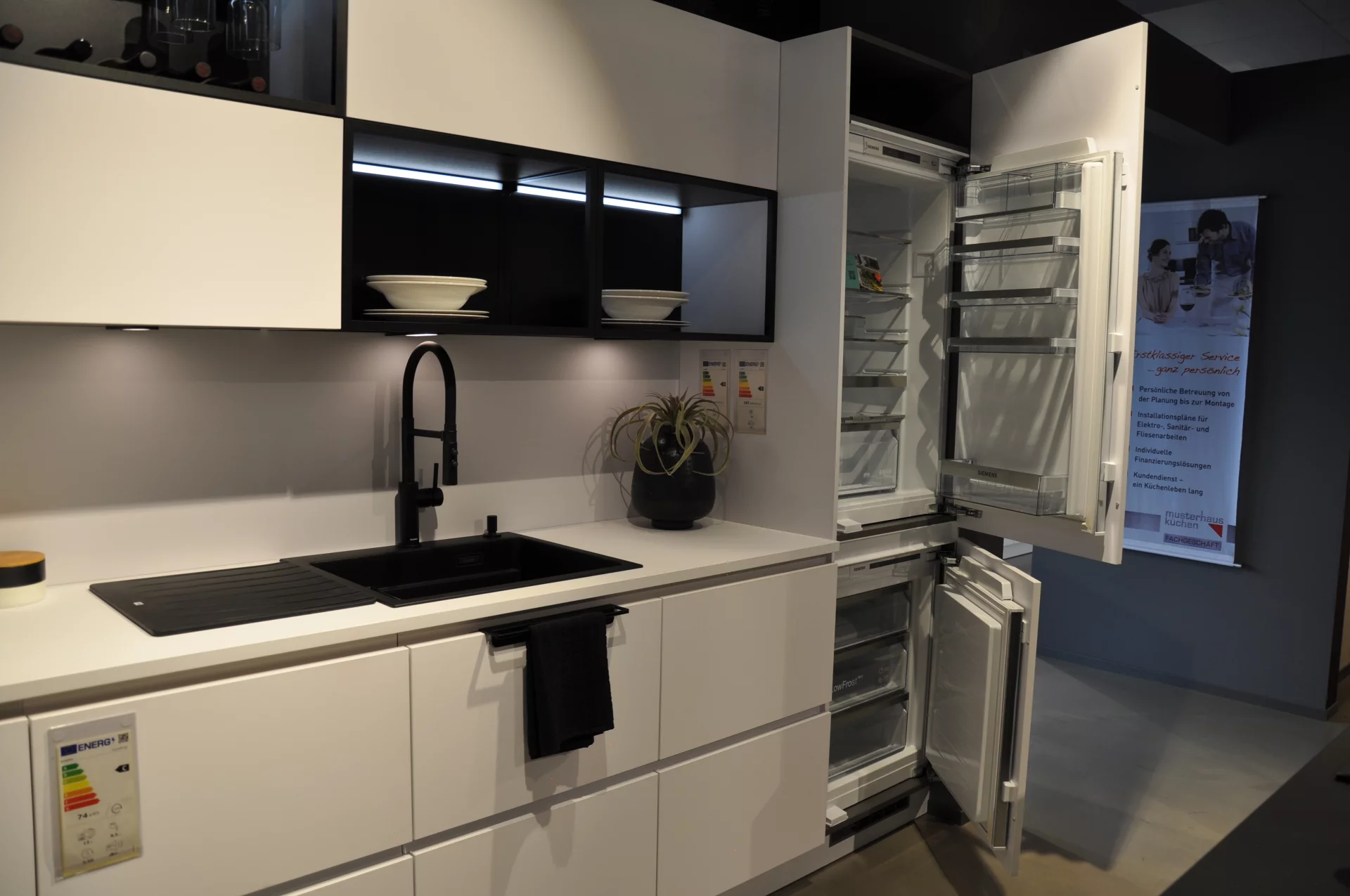 HÄCKER Systemat Küche "AV2135-GL Polarweiß Mattlack // Schwarz Mattlack" ausgestattet mit Marken Geräten der Firma Siemens und Berbel. Die Küche lässt sich frei umplanen und beliebig erweitern.